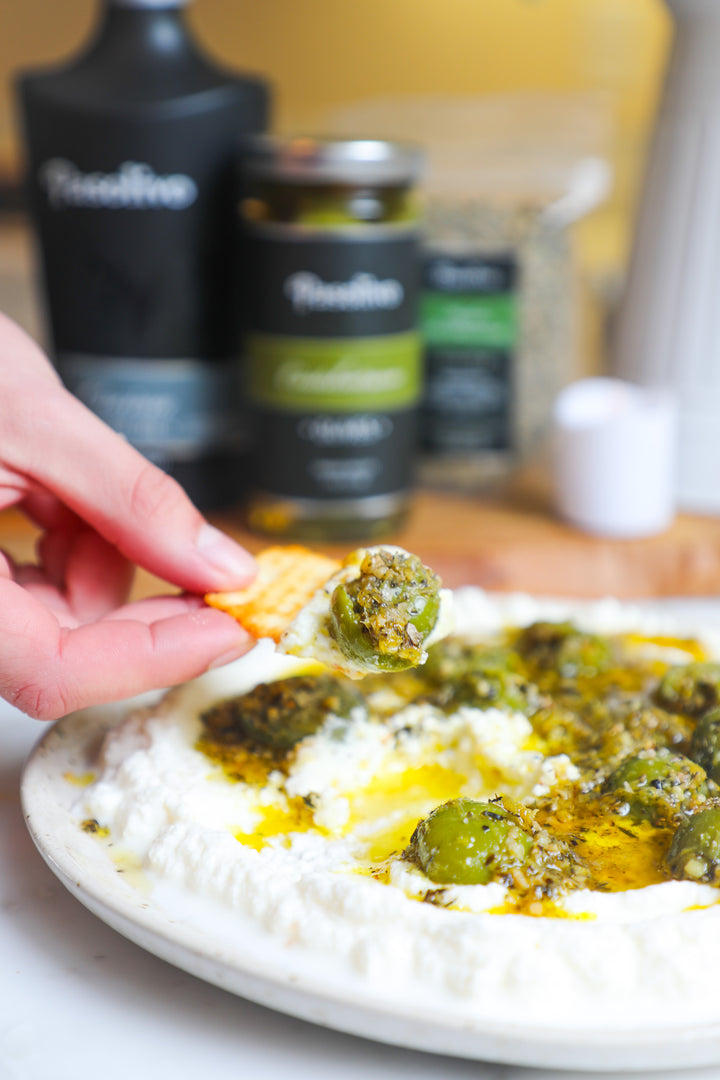 To assemble, spread the whipped ricotta into a shallow serving dish. Spoon the marinated olives and oil over the top. Finish with a light sprinkle of Pasolivo Himalayan Pink Sea Salt and serve with crackers or crostini.