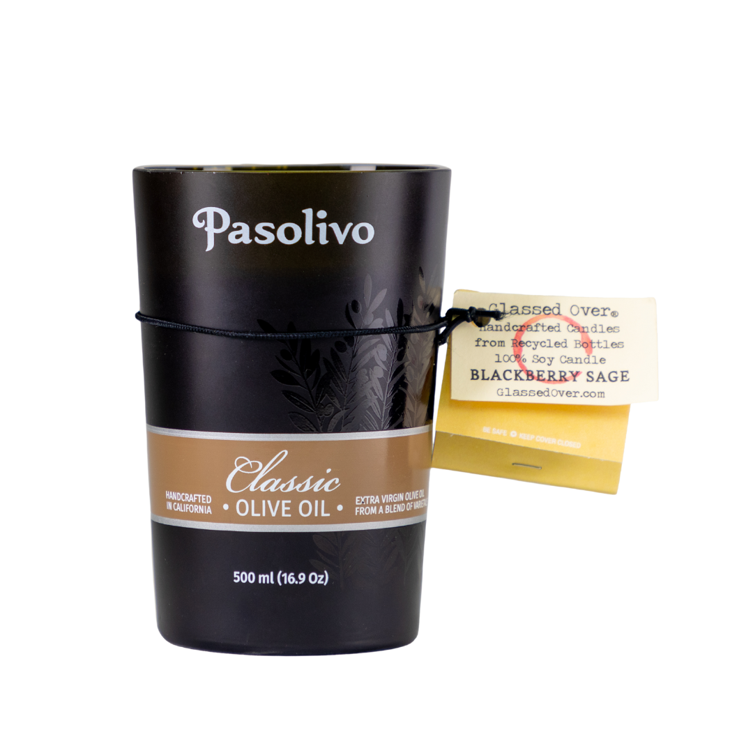 Every candle is poured in a random recycled olive oil bottle. The bottle may or may not be labeled with an olive oil flavor.