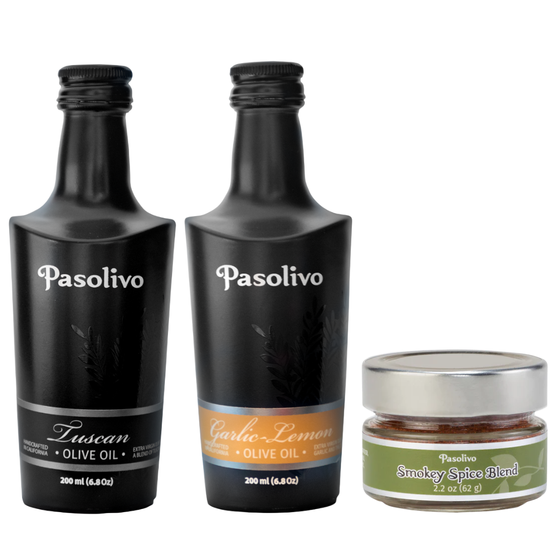 A must-have gift set for the grill master in your life! Featuring Tuscan EVOO for richness, Garlic Lemon Olive Oil for a bright, savory touch, and our Smokey Spice Blend for the perfect finishing flavor, this trio makes every cookout unforgettable! Beautifully packaged in our signature black gift box for a luxurious finish.