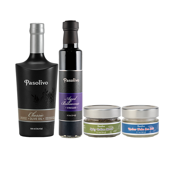 The Kitchen Staples Set offers a little bit of everything you need to create simple, delicious meals at home. Featuring our award-winning extra virgin olive oil, rich aged balsamic vinegar, a versatile signature spice blend, and a premium sea salt, this collection covers the key elements for building flavor in any dish.Â