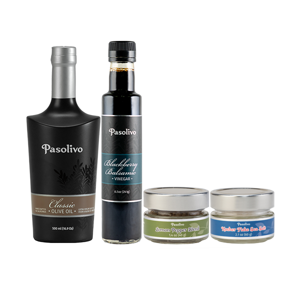 This Pasolivo Classics gift set includes four of our finest Pasolivo products. These items are very versatile and can be used in everyday cooking. This complete set comes with: 500ml of Classic Olive Oil, Blackberry Balsamic Vinegar, Pacific Blue Kosher Sea Salt, and Lemon Pepper Blend.